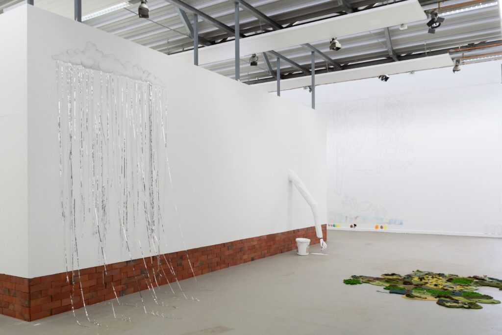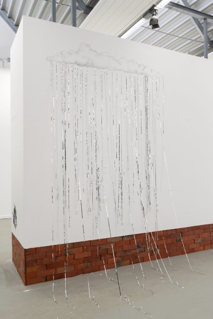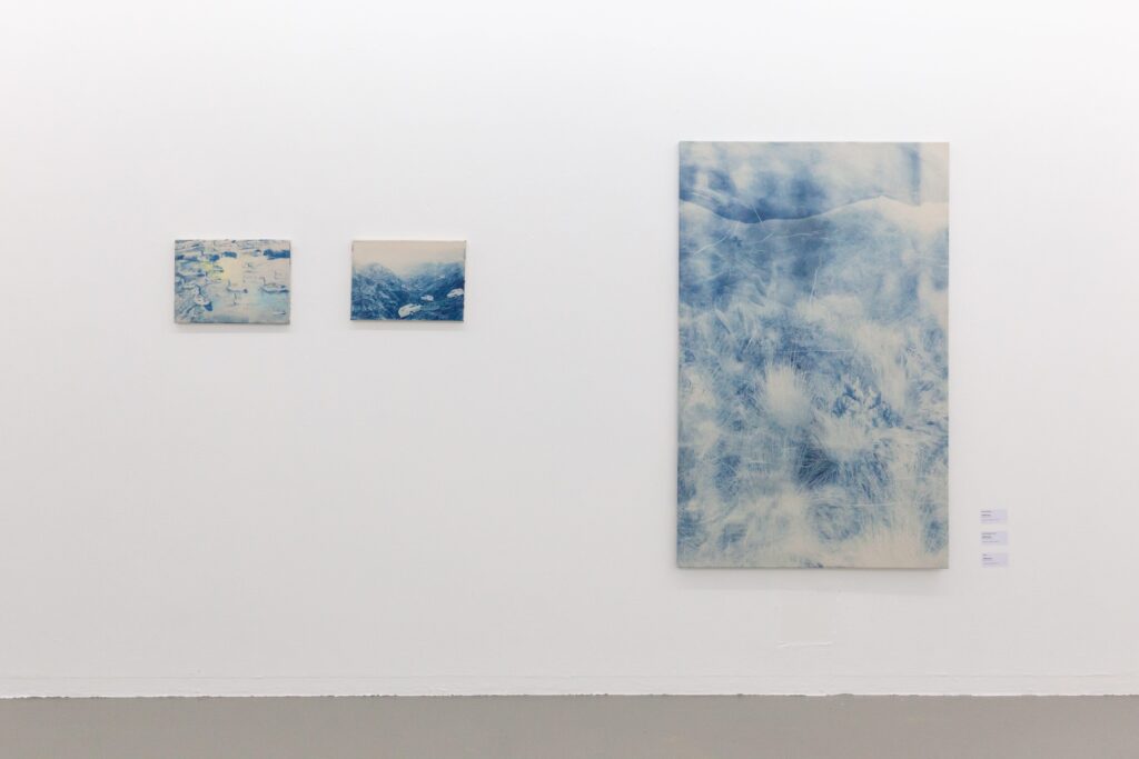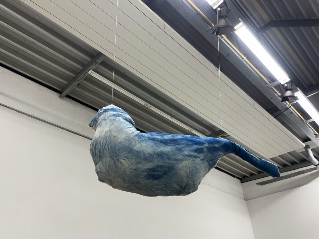 Rundgang 2026, Ausstellungsraum 2Liebe, 2026 cyanotypie auf leinwand 95 x 150 cmspatz (fliegend), 2026 cyanotypie auf leinwand, füllung, nylonfaden 65 x 38 x 15 cm es regnet, 2026 bleistift maße variabelziegel (wand), 2026 reimchen, holzplatte, kleber 108 x 824 cm